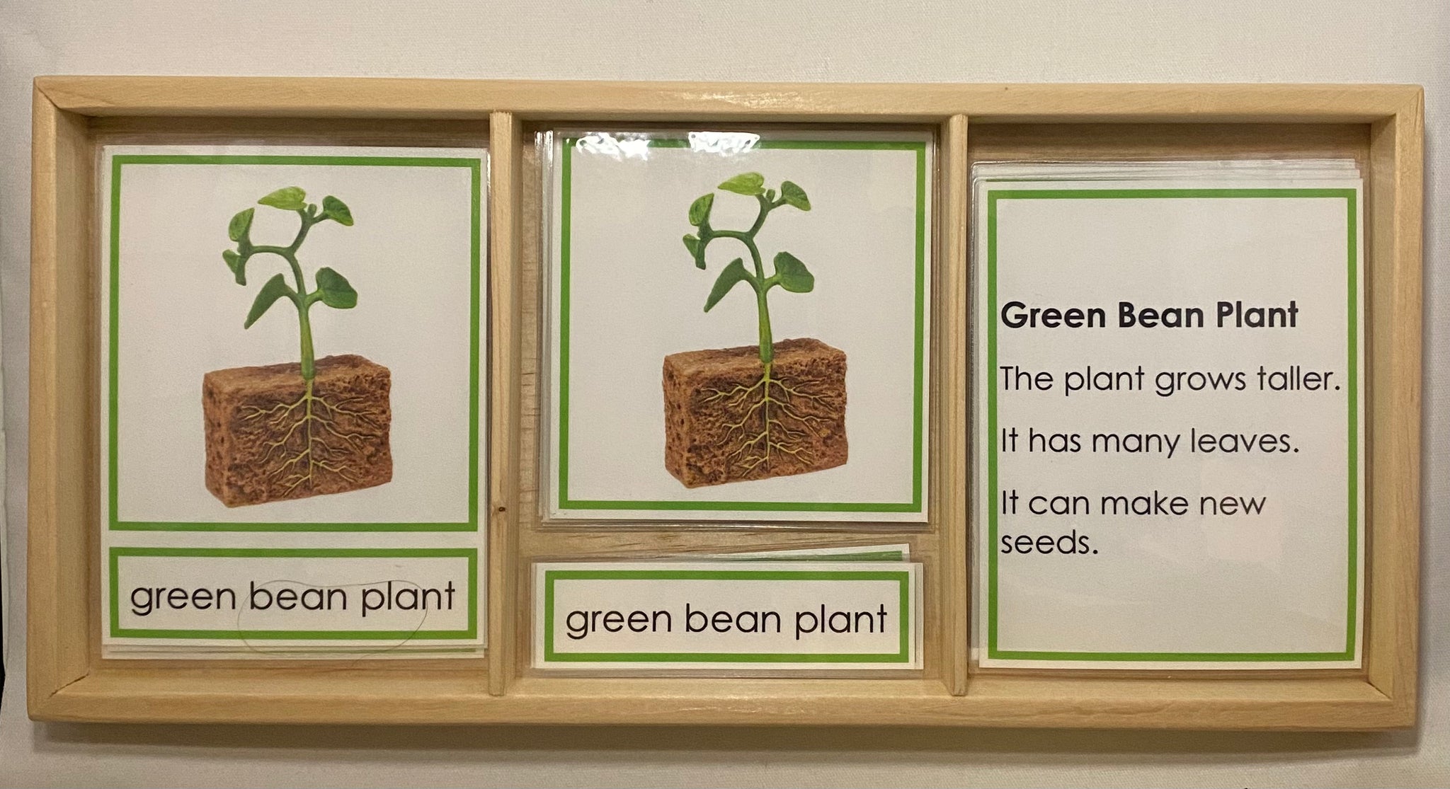 Children explore the stages of bean germination by matching objects to picture cards, pairing labels with images, and using control cards for self-checking. Description cards provide clear, simple sentences for reading practice and three period lessons.