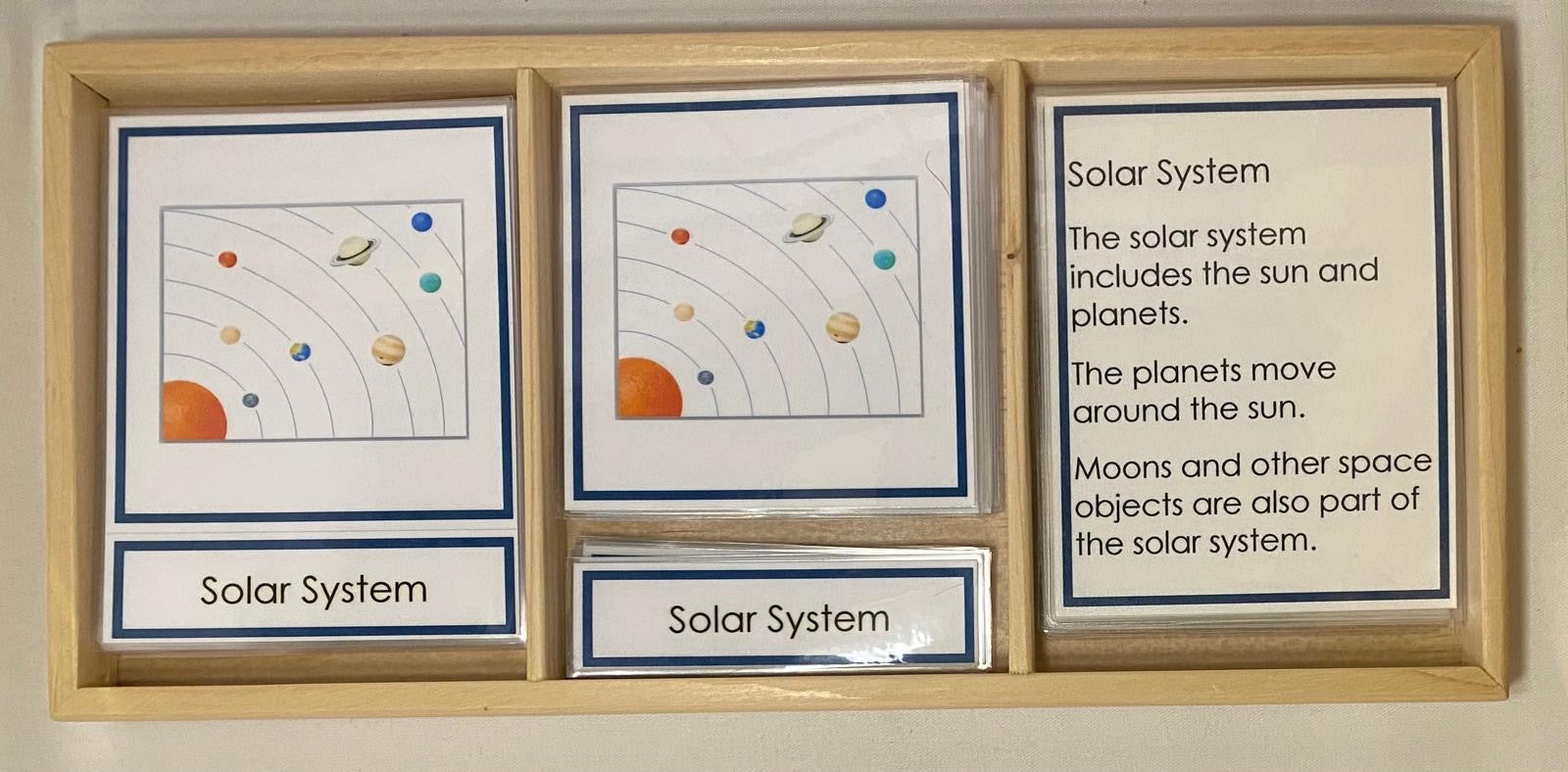 Montessori Solar System Classification Set with 3-Part Cards, miniature planet objects, and simple description cards. This hands-on astronomy material supports planet vocabulary, early reading, and classification skills.